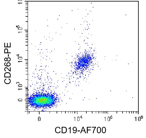 • Staining of normal human peripheral blood mononuclear cells (PBMCs) using AF700 CD19 Antibody and PE Human CD268/BAFF-R Antibody (Clone: 11C1) (Catalog Number: H2162). Analysis data derived from lymphocytes.