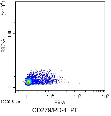 • Staining of normal human peripheral blood mononuclear cells (PBMCs) using Anti-CD3 Antibody and PE Anti-Human CD279/PD-1 Antibody (Clone: EH12.2H7) (Product No.: H0437). Analyzed data are derived from lymphocytes.
