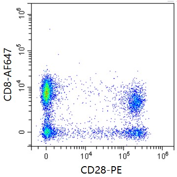 • Staining of normal human peripheral blood mononuclear cells (PBMCs) using AF647 Anti-CD8 Antibody and PE Anti-Human CD28 Antibody (Clone: CD28.2) (Product No.: H4097). Analyzed data are derived from lymphocytes.