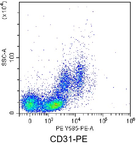 • Staining of normal human peripheral blood mononuclear cells (PBMCs) using PE Human CD31 Antibody (Clone: AC128) (Catalog Number: H0242). Analysis data derived from live cells.