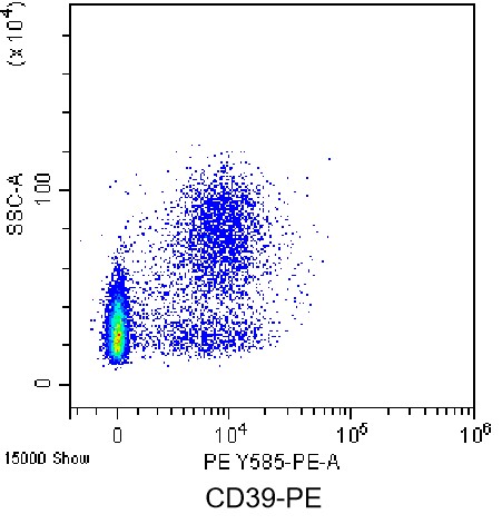 • Staining of normal human peripheral blood mononuclear cells (PBMCs) using PE Anti-Human CD39 Antibody (Clone: A1) (Product No.: H3377). Analyzed data are derived from total cells.