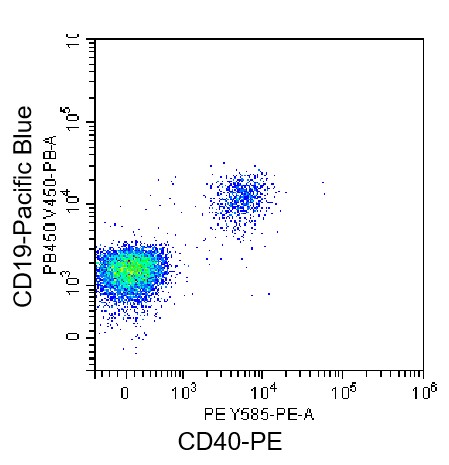 • Staining of normal human peripheral blood mononuclear cells (PBMCs) using PB Anti-CD19 Antibody and PE Anti-Human CD40 Antibody (Clone: 5C3) (Product No.: H0557). Analyzed data are derived from lymphocytes.