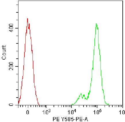 • Staining of normal human peripheral blood mononuclear cells (PBMCs) (green) using PE Human CD45 Antibody (Clone: 5B1) (Catalog Number: H0107) and blank control (red). Analysis data derived from lymphocytes.