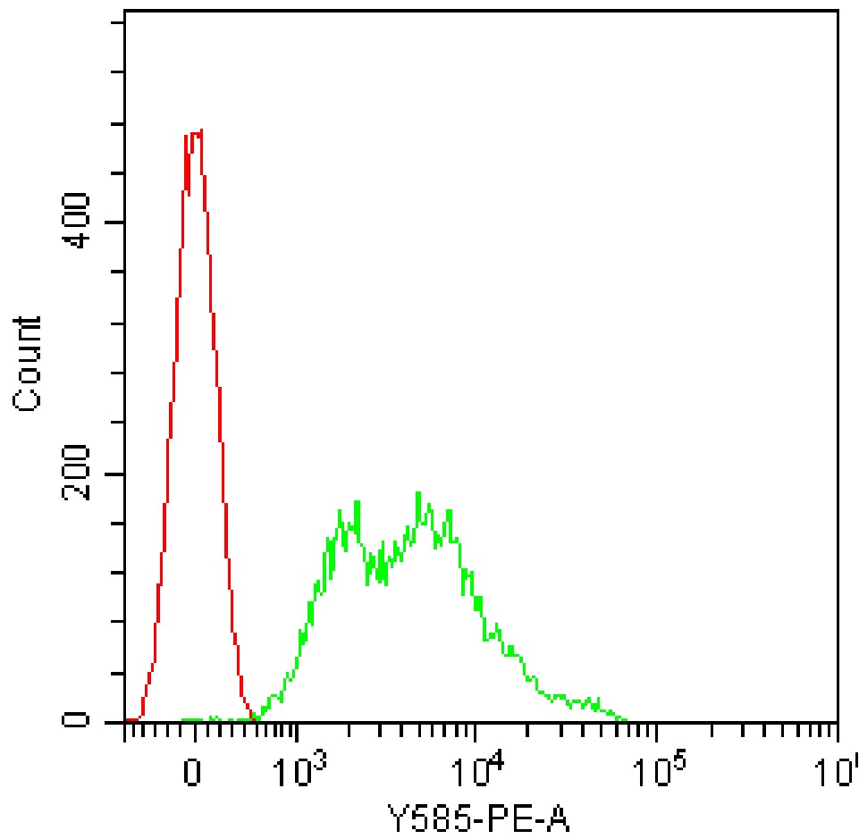 • Staining normal human peripheral blood mononuclear cells (HPBMCs) with PE Human CD53 Antibody (Clone: HI29) (Product Number: H3182) for extracellular staining (green, red is unstained control). Analysis was performed on total live cells.