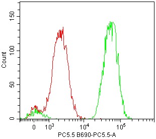 • Staining of platelets enriched from normal human peripheral blood using PE Anti-Human CD61 Antibody (Clone: VI-PL2) (Product No.: H3962) (Green, red is blank cells). Analyzed data are derived from lymphocytes.