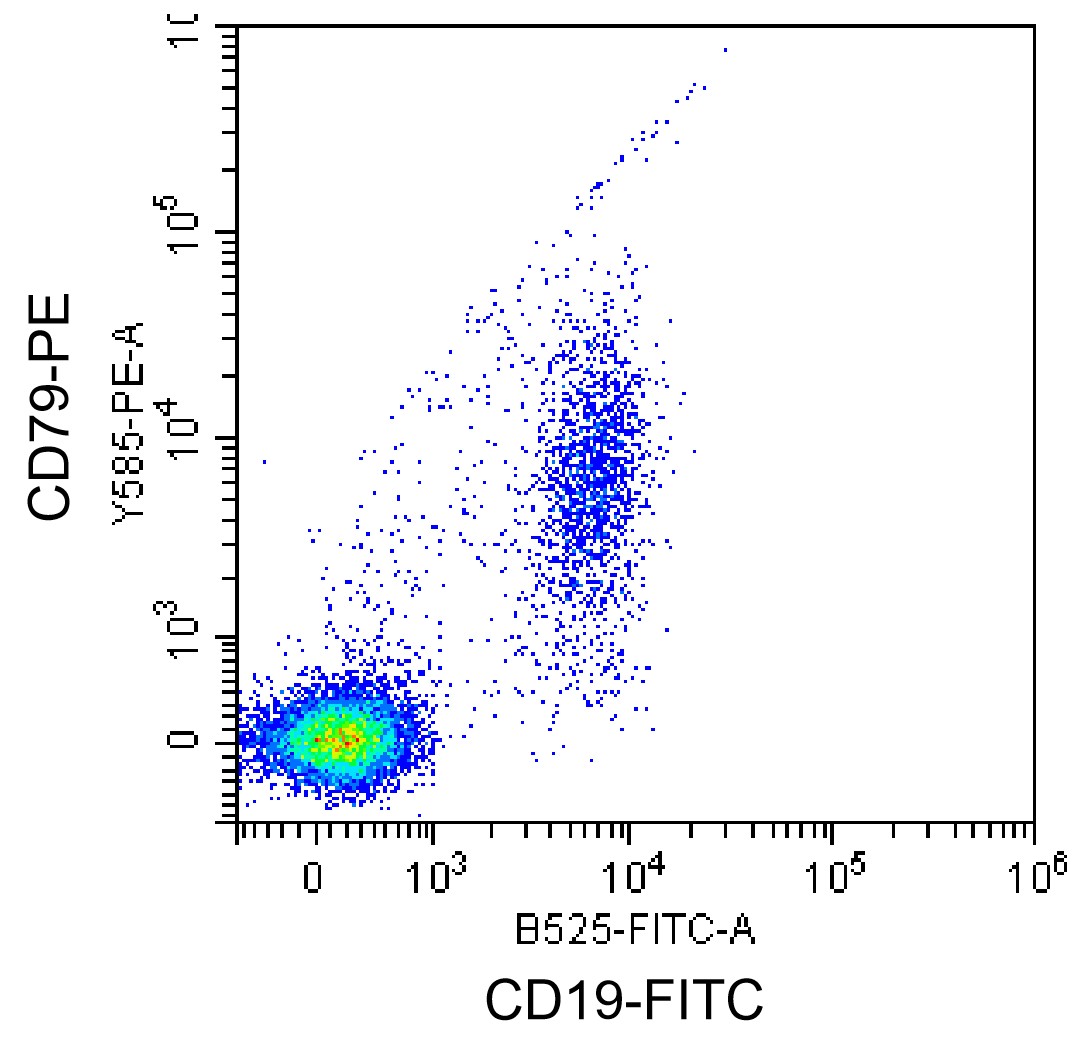 • Staining normal human peripheral blood mononuclear cells (PBMCs) with PE Human CD79b/Igβ Antibody (Clone: CB3-1) (Product Number: H1997), and FITC CD19 Antibody. Analysis was performed on lymphocytes.