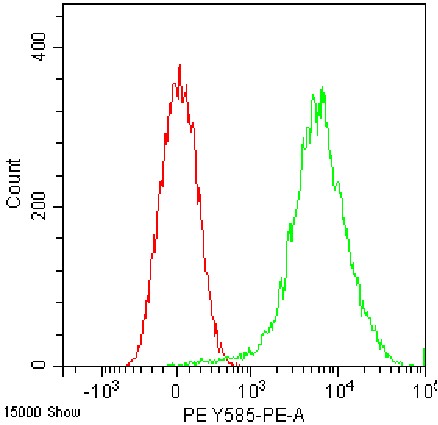 • Staining of normal human peripheral blood mononuclear cells (PBMCs) using PE Anti-Human CD81 Antibody (Clone: JS-81) (Product No.: H2417) (green, red is blank control). Analyzed data are derived from lymphocytes.