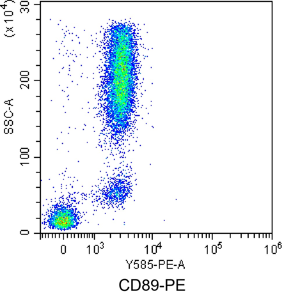 CD89是IgA的Fc受体(FcαR),一种55-75 kDa的糖蛋白,专门在外周血的粒细胞和单核细胞/巨噬细胞谱系细胞上表达,但不在淋巴细胞上表达。它也在骨髓中的早幼粒细胞以及固定单核细胞的细胞质中表达。该抗CD89的抗体不阻断IgA结合,并且比天然IgA配体更有效地分离FcαR分子。FcαR在触发吞噬作用和呼吸爆发中发挥作用。