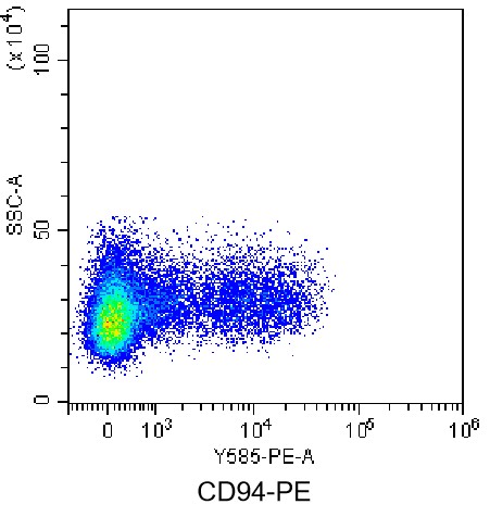 • Staining of normal human peripheral blood mononuclear cells (PBMCs) with PE anti-human CD94 Antibody (Clone: HP-3D9) (Product Code: H1817). Analysis data derived from lymphocytes.