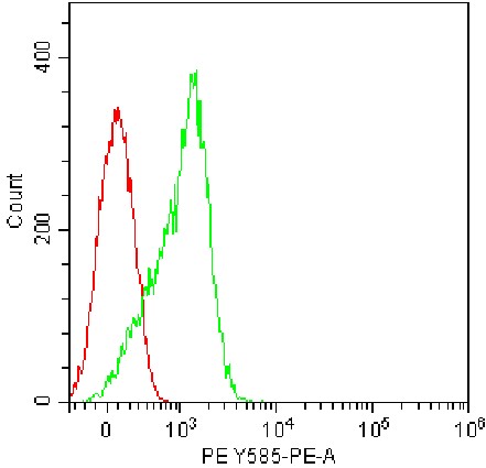 • Staining of fixed/permeabilized MOLT-4 cell line cells using PE Human Galectin-9 Antibody (Clone: 9M1-3) (Product No.: H1697) (Green, Red: Blank Control). Analyzed data are derived from total live cells.