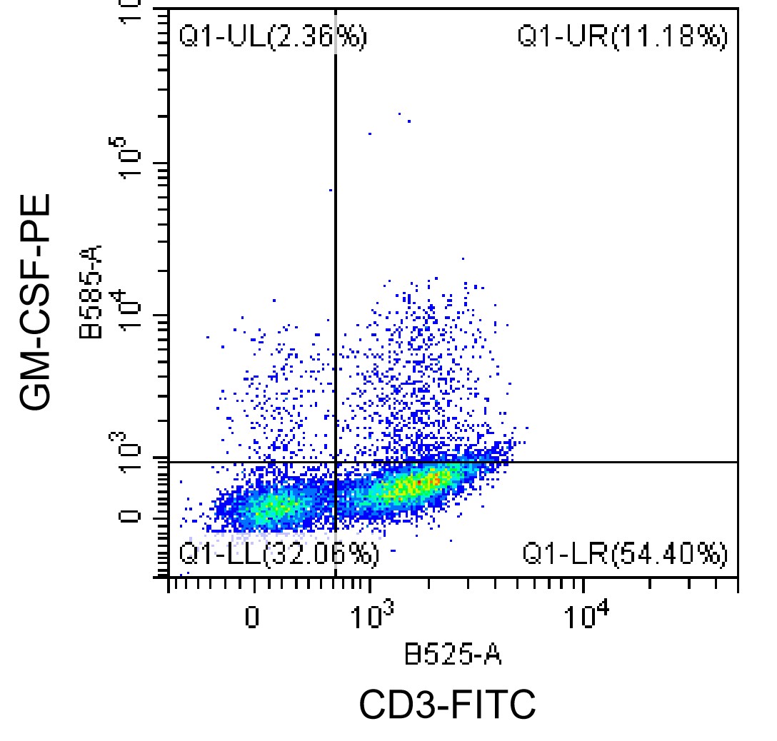 • Staining normal human peripheral blood mononuclear cells (PBMCs) stimulated with Cell Activation Cocktail (with Brefeldin A) for 3 days and fixed/permeabilized with fixation/permeabilization buffer with PE Human GM-CSF Antibody (Clone: BVD2-21C11) (Product Number: H1892), and FITC CD3 Antibody. Analysis was performed on lymphocytes.