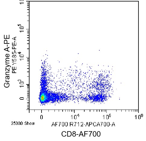 • Surface staining of normal human peripheral blood mononuclear cells (PBMCs) using AF700 CD8a Antibody, followed by permeabilization with fixation/permeabilization reagent, then intracellular staining using PE Human Granzyme A Antibody (Clone: CB9) (Catalog Number: H2072). Analysis data derived from cells in the lymphocyte gate.