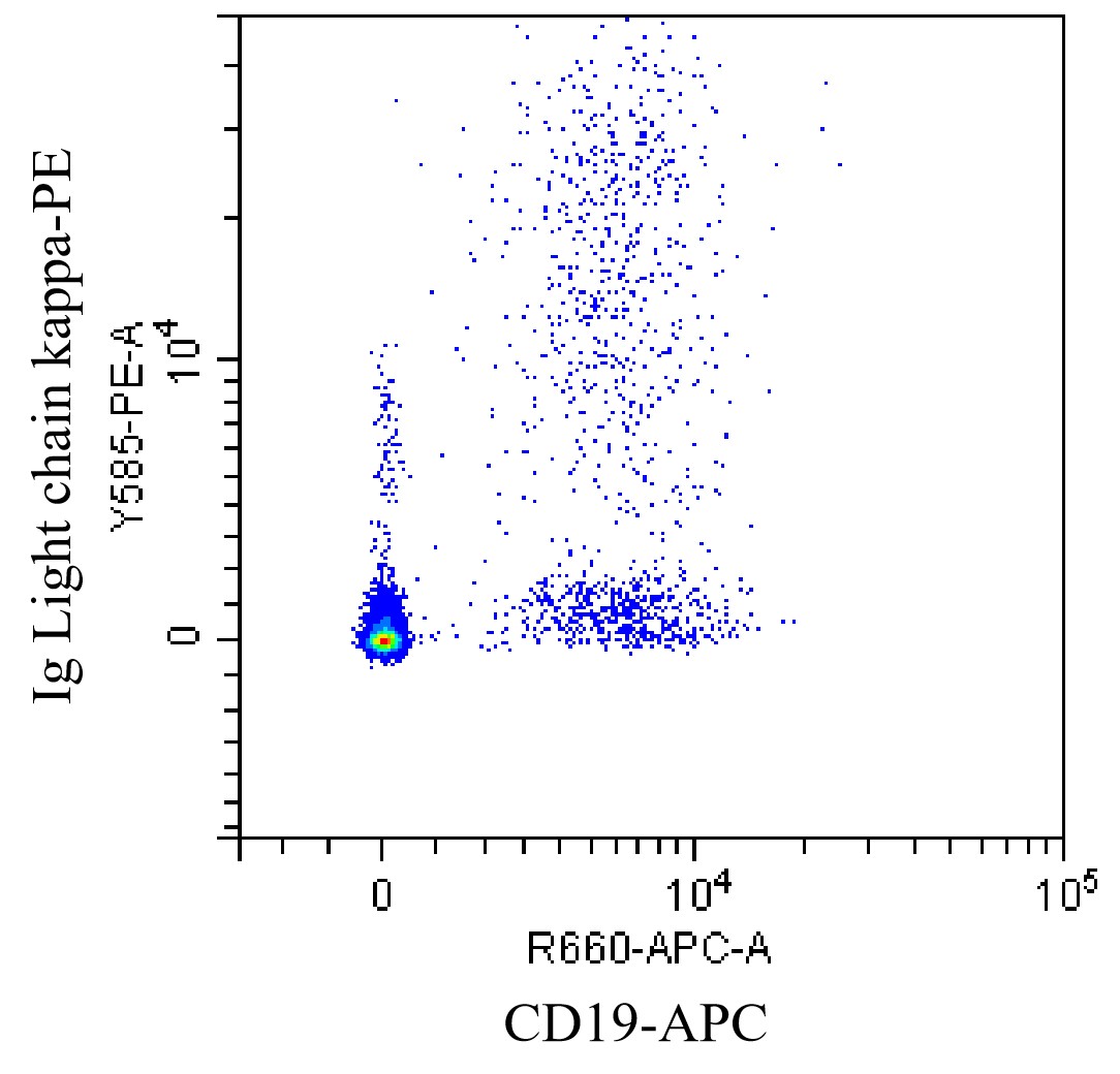 • Staining normal human peripheral blood mononuclear cells (PBMCs) with APC CD19 Antibody and PE Human Ig light chain κ Antibody (Clone: MHK-49) (Product Number: H3662). Analysis was performed on lymphocytes.