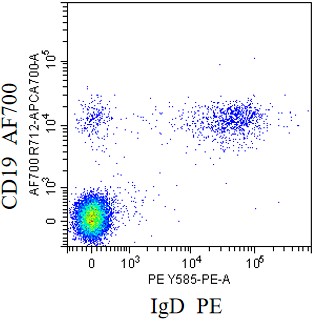 • Staining of normal human peripheral blood mononuclear cells (PBMCs) using AF700 Anti-CD19 Antibody and PE Anti-Human IgD Antibody (Clone: IA6-2) (Product No.: H3692). Analyzed data are derived from lymphocytes.