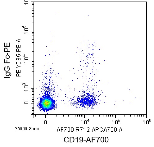 • Staining of normal human peripheral blood mononuclear cells (PBMCs) using AF700 CD19 Antibody and PE Human IgG Fc Antibody (Clone: M1310G05) (Catalog Number: H2267). Analysis data derived from lymphocytes.