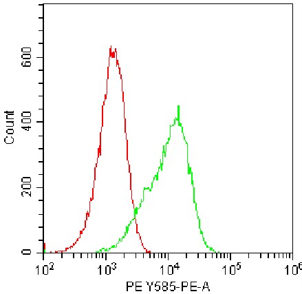 • Staining of fixed/permeabilized HEK-293F cells transfected with human IL-10 plasmid using PE Human IL-10 Antibody (Clone: JES3-19F1) (Product No.: H0797) (Green, Red: Blank Control). Analyzed data are derived from total cells.