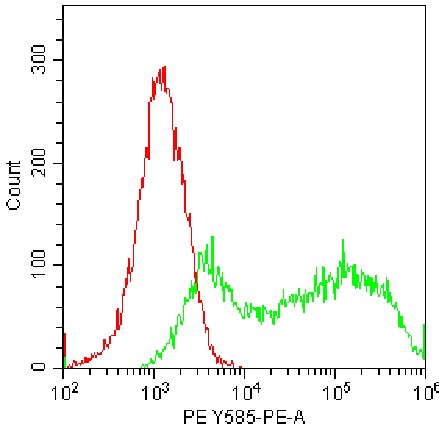 • Staining of fixed/permeabilized HEK-293F cells transfected with pLV3-CMV-IL2(human)-mCherry-Puro plasmid using PE Anti-Human IL-2 Antibody (Clone: MQ1-17H12) (Product No.: H1217) (green, red is blank control). Analyzed data are derived from total cells.