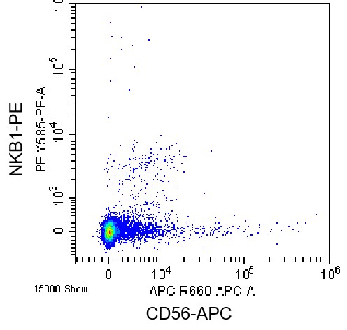 • Staining of normal human peripheral blood mononuclear cells (PBMCs) using APC Anti-CD56 Antibody and PE Anti-Human NKB1 Antibody (Clone: DX9) (Product No.: H2627). Analyzed data are derived from lymphocytes.