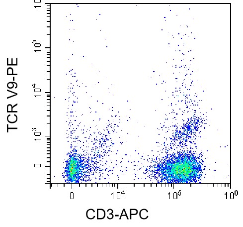 • Staining of normal human peripheral blood mononuclear cells (PBMCs) using APC CD3 Antibody and PE Human TCR Vγ9 Antibody (Clone: 3G8.5) (Catalog Number: H2492). Analysis data derived from lymphocytes.
