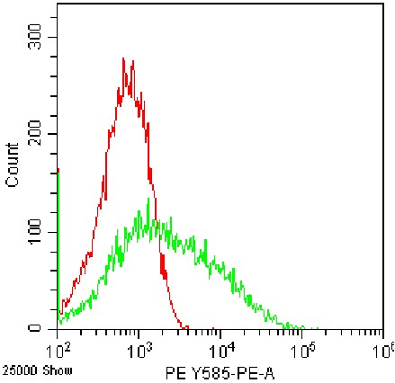 • Staining of fixed/permeabilized HEK-293F cell line cells transfected with Human, IFN gamma cDNA ORF Clone, Flag plasmid (green) using PE IFN-λ Antibody (Clone: 4S.B3) (Catalog Number: H0122) and blank control (red). Analysis data derived from total cells.