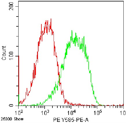 • Staining of fixed/permeabilized HEK-293F cell line cells transfected with plasmid containing mouse IL-12/IL-23 p40 fragment (green) using PE IL-12/IL-23 p40 Antibody (Clone: C17.8) (Catalog Number: G1907) and blank control (red). Analysis data derived from total cells.
