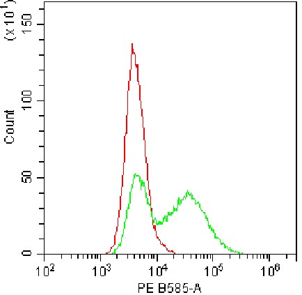 • Staining of permeabilized HEK-293F cells transfected with human IL-17A plasmid using fixation/permeabilization buffer with PE anti-mouse IL-17A Antibody (Clone: G2J2) (Product Code: G0182) (green, red is unstained control). Analysis data derived from total cells.
