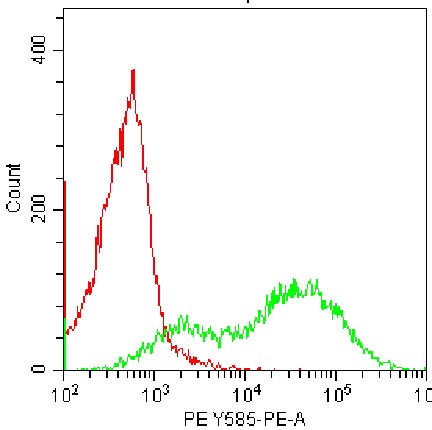 • Staining of fixed/permeabilized HEK-293F cells transfected with human IRF4 (IL-18Rα) plasmid using PE IRF4 Antibody (Clone: 3E4) (Selleck CatNo.: G2537) (Green, Red: Blank Control). Analyzed data are derived from total cells.