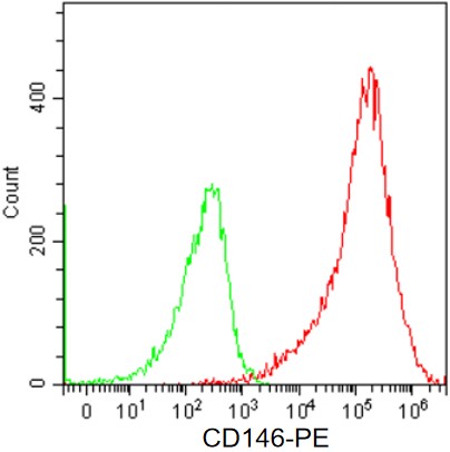 • Staining of bEnd.3 cells using PE Anti-Mouse CD146 Antibody (Clone: ME-9F1) (Product No.: G0977) (red, green is blank control). Analyzed data are derived from live lymphocytes.