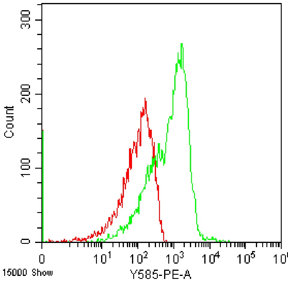 • Staining C57BL/6 mouse bone marrow cells with PE Mouse CD16.2/FcγRIV Antibody (Clone: 9E9) (Product Number: G1532) (green, red is unstained control). Analysis was performed on total live cells.