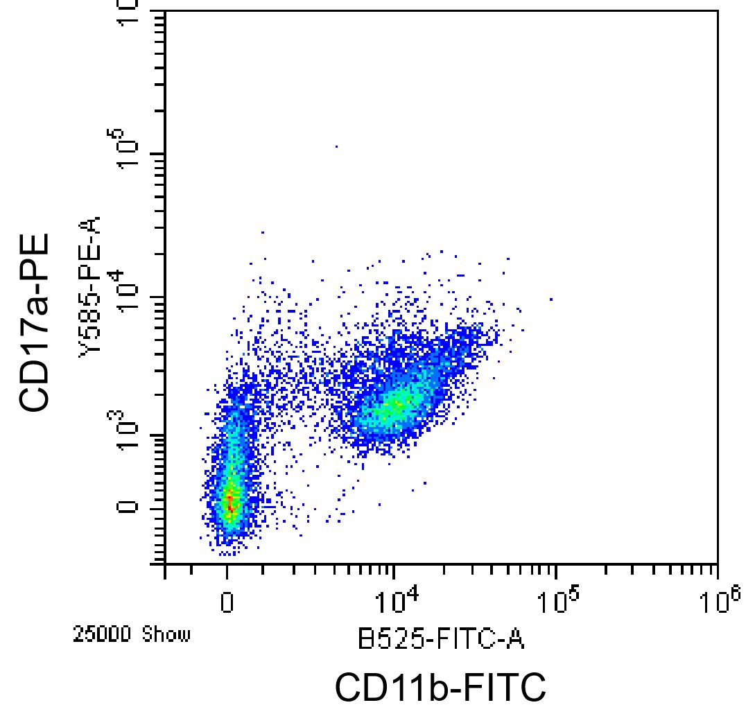 • Staining C57BL/6 mouse bone marrow cells with FITC CD11b Antibody and PE Mouse CD172a/SIRPα Antibody (Clone: P84) (Product Number: G3002). Analysis was performed on live lymphocytes.