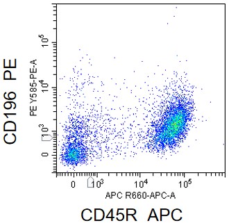 • Staining of splenic lymphocytes from C57BL/6 mice using APC Anti-CD45R Antibody and PE Anti-Mouse CD196/CCR6 Antibody (Clone: 29-2L17) (Product No.: G3017). Analyzed data are derived from live lymphocytes.