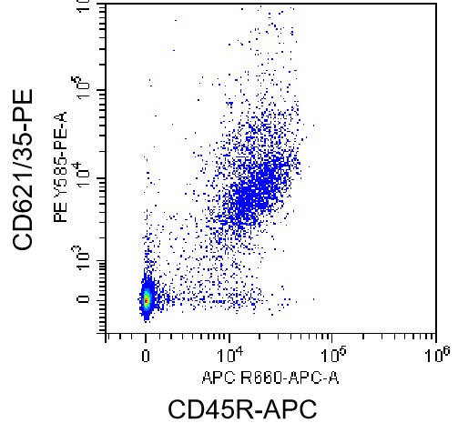• Staining of splenic lymphocytes from C57BL/6 mice using APC Anti-CD45R Antibody and PE Anti-Mouse CD21/CD35 Antibody (Clone: 7G6) (Product No.: G0812). Analyzed data are derived from live lymphocytes.