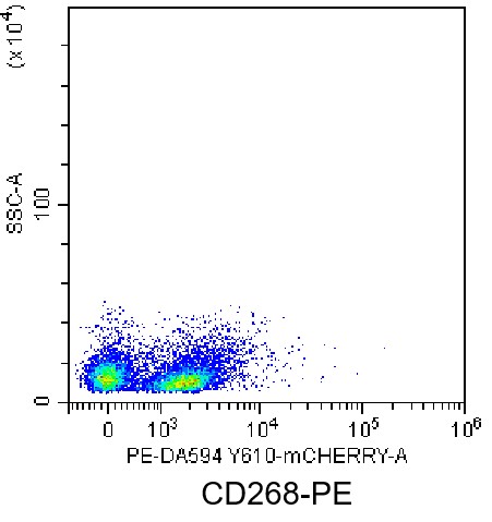 • Staining of C57BL/6 mouse splenic lymphocytes using PE Mouse CD268/BAFF-R Antibody (Clone: 7H22-E16) (Catalog Number: G1862). Analysis data derived from live lymphocytes.