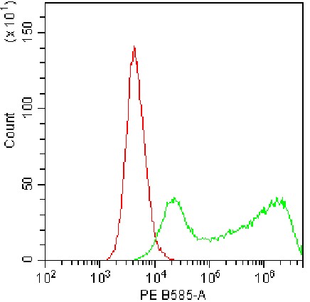 • Staining of permeabilized HEK-293F cells transfected with pLV3-CMV-Mgl2(mouse)-3×FLAG-CopGFP-Puro plasmid using fixation/permeabilization buffer with PE anti-mouse CD301b/MGL2 Antibody (Clone: URA-1) (Product Code: G2237) (green, red is unstained control). Analysis data derived from total cells.