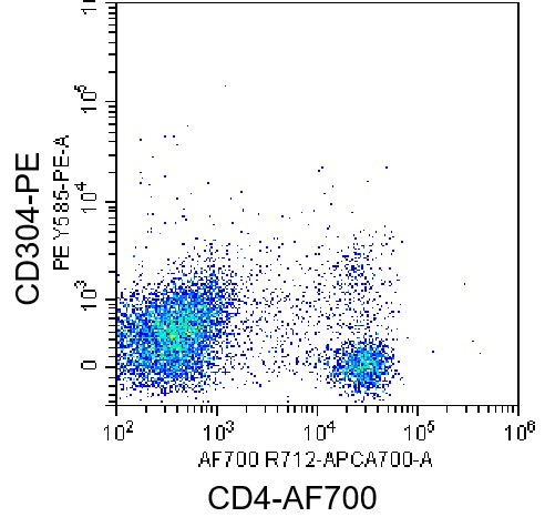 • Staining of splenic lymphocytes from C57BL/6 mice blocked with CD16/CD32 Antibody (Selleck Cat#: A2110) using AF700 CD4 Antibody and PE Mouse CD304 Antibody (Clone: 3E12) (Selleck Cat#: G1337). Analyzed data are derived from total live cells.
