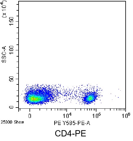 • Staining of splenic lymphocytes from C57BL/6 mice using PE Anti-Mouse CD4 Antibody (Clone: GK1.5) (Product No.: G4142). Analyzed data are derived from live lymphocytes.
