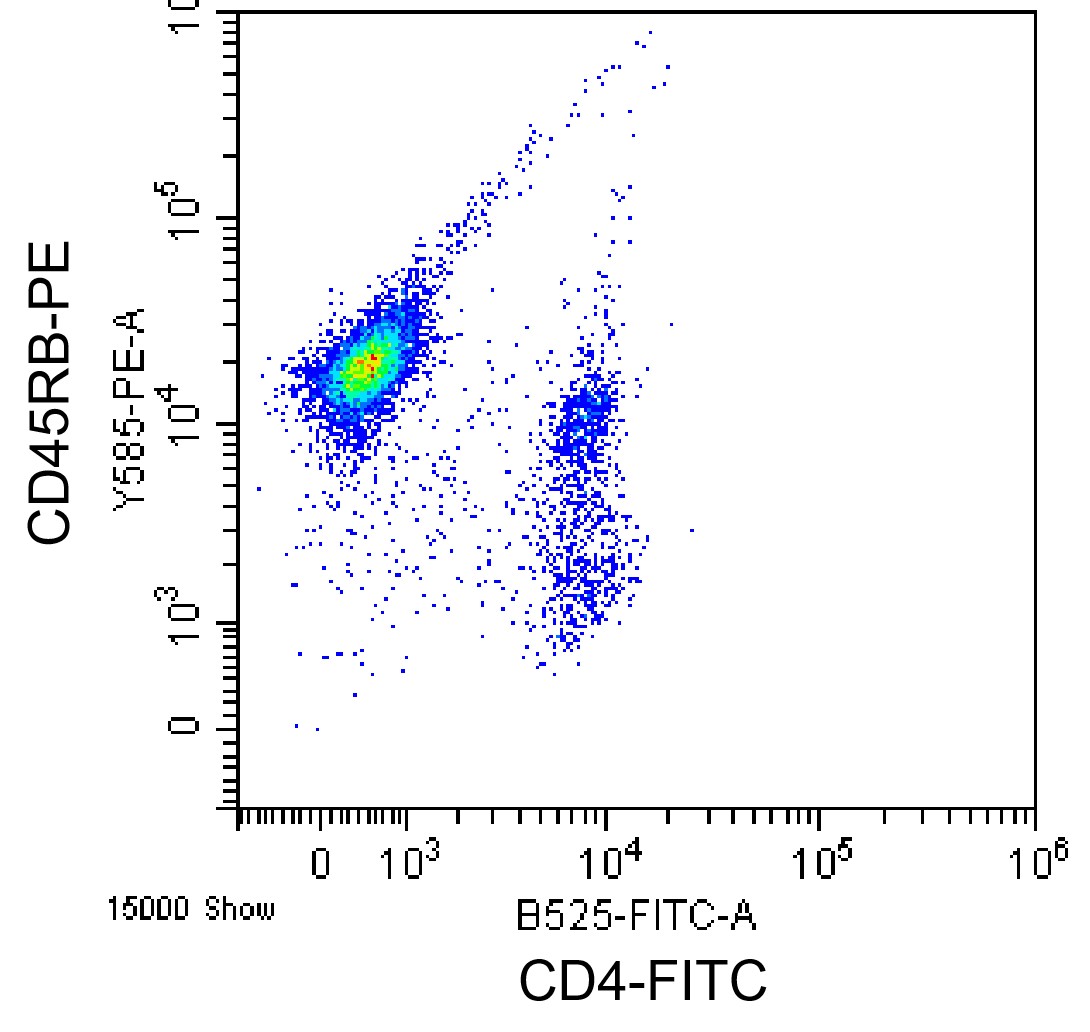 • Staining C57BL/6 mouse splenocytes with PE Mouse CD45RB Antibody (Clone: C363.16A) (Product Number: G1652) and FITC CD4 Antibody. Analysis was performed on total live cells.