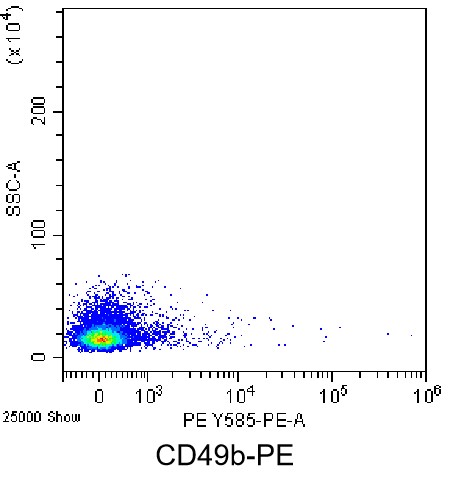 • Staining of splenic lymphocytes from C57BL/6 mice (blocked with rat anti-mouse CD16/CD32) using PE Anti-Mouse CD49b Antibody (Clone: DX5) (Product No.: G0527). Analyzed data are derived from total cells.