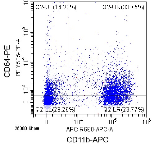 • Staining of bone marrow cells from C57BL/6 mice using APC Anti-CD11b Antibody and PE Anti-Mouse CD64 Antibody (Clone: X54-5/7.1) (Product No.: G2942). Analyzed data are derived from live cells.