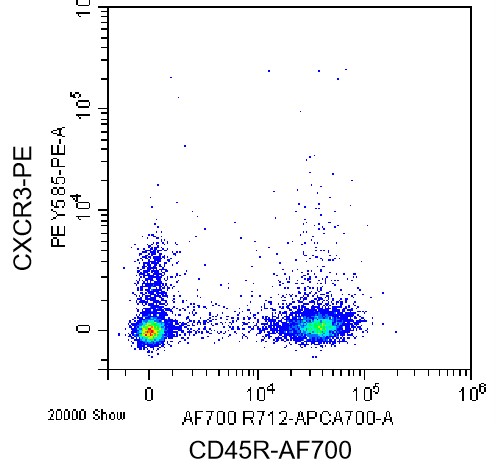 • Staining of splenic lymphocytes from C57BL/6 mice using AF700 Anti-CD45R Antibody and PE Anti-Mouse CXCR3 Antibody (Clone: CXCR3-173) (Product No.: G4367). Analyzed data are derived from live lymphocytes.