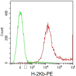 • Staining of splenic lymphocytes from C57BL/7 mice using PE Anti-Mouse H-2Kb Antibody (Clone: AF6-88.5) (Product No.: G1802) (red, green is blank control). Analyzed data are derived from live lymphocytes.