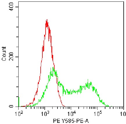 • Staining of permeabilized HEK-293F cell line cells transfected with pCMV-Il10(mouse)-3×FLAG-Neo plasmid (permeabilized using fixation/permeabilization buffer) using PE Anti-Mouse IL-10 Antibody (Clone: JES5-16E3) (Product No.: G0782) (green, red is unstained control). Analyzed data are derived from total cells.