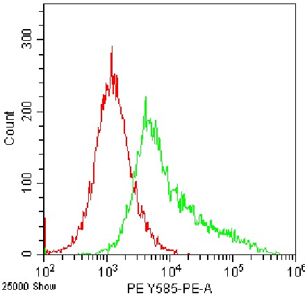 • Staining of permeabilized HEK-293F cell line cells transfected with pCMV-Il10(mouse)-3×FLAG-Neo plasmid (permeabilized using fixation/permeabilization buffer) using PE Anti-Mouse IL-4 Antibody (Clone: JES5-16E3) (Product No.: G4217) (green, red is unstained control). Analyzed data are derived from total cells.