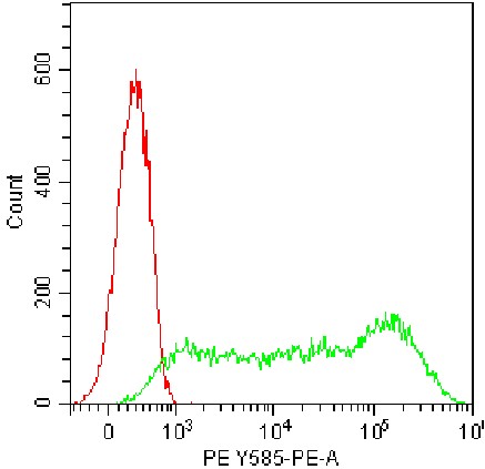 • Staining of fixed/permeabilized HEK-293F cells transfected with mouse LAG-3 plasmid using PE Mouse LAG-3 Antibody (Clone: C9B7W) (Product No.: G4322) (Green, Red: Blank Control). Analyzed data are derived from total cells.