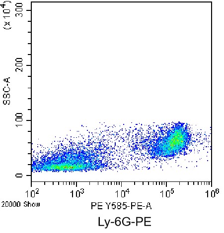 • Staining of bone marrow cells from C57BL/6 mice using PE Anti-Mouse Ly6G Antibody (Clone: 1A8) (Product No.: G4427). Analyzed data are derived from live lymphocytes.