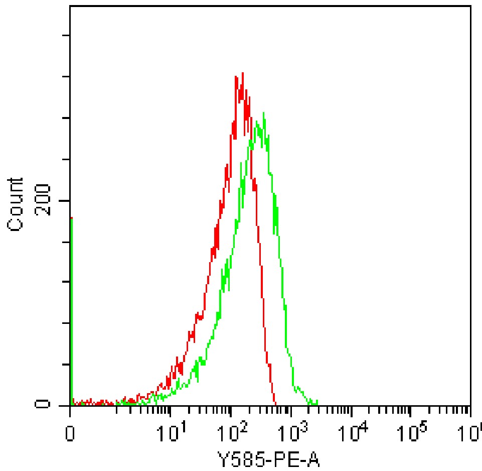• Staining C57BL/6 spleen stimulated with ConA for three days with PE Mouse PD-1/CD279 Antibody (Clone: RMP1-14) (Product Number: G4517) (green, red is unstained control). Analysis was performed on total live cells.