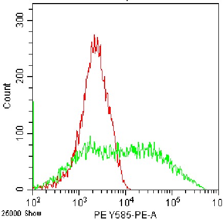 • Staining of fixed/permeabilized HEK-293F cell line cells transfected with pCMV-TIGIT(mouse)-SV40-Neo plasmid (green) using PE mouse TIGIT Antibody (Clone: 1G9) (Catalog Number: G4892) and blank control (red). Analysis data derived from total cells.