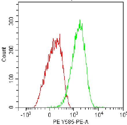 • Staining of Hela cells stimulated with 50uM Etoposide (Selleck Cat# S1225) for 30min using PE Phospho-Histone H2A.X (Ser139) Antibody (Clone: E5F13) (Product No.: G3842) (Green, Red: Blank Control). Analyzed data are derived from total live cells.