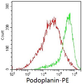 • Staining of TE-72 cell line cells using PE Anti-Podoplanin Antibody (Clone: L7B2) (Product No.: G1292) (green, red is blank control). Analyzed data are derived from live cells.