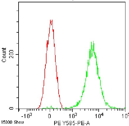 • Intracellular staining of healthy human peripheral blood mononuclear cells (HPBMCs) permeabilized using fixation/permeabilization buffer using PE Anti-TLR9 Antibody (Clone: 26C593.2) (Product No.: H2342) (green, red is blank control). Analyzed data are derived from cells in the lymphocyte gate.